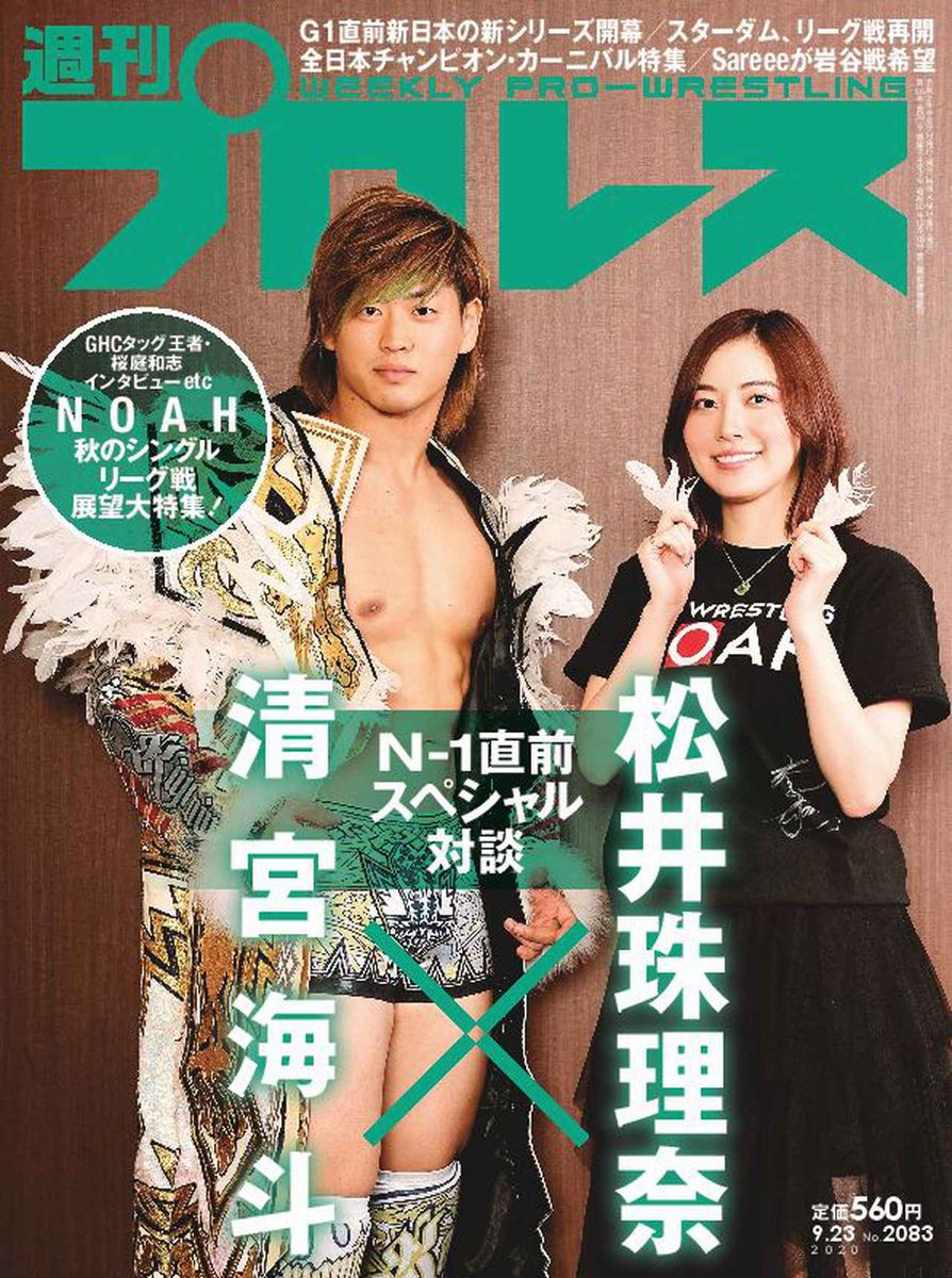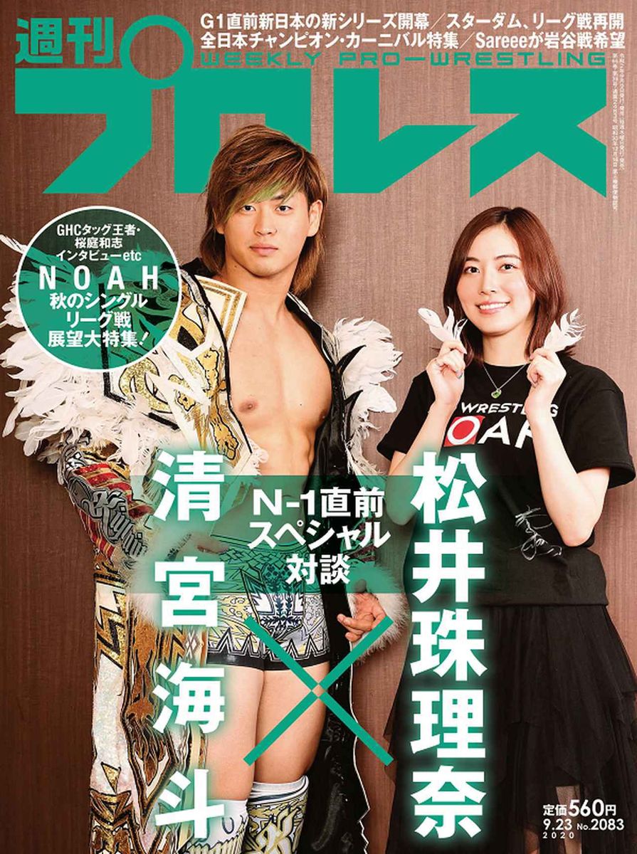 今週号の表紙は開幕が目前に迫ったNOAHのシングルリーグ戦「N-1 VICTORY」特集でスペシャル対談をおこなった清宮海斗&松井珠理奈(SKE48)の豪華ツーショットです。若くしてプロレス界とアイドル界のトップを取った2人の対談を巻頭カラーから8ページで特写もまじえて掲載。N-1特集としては桜庭和志インタビュー、注目リーグ戦紹介などもあるので開幕前に必読。
