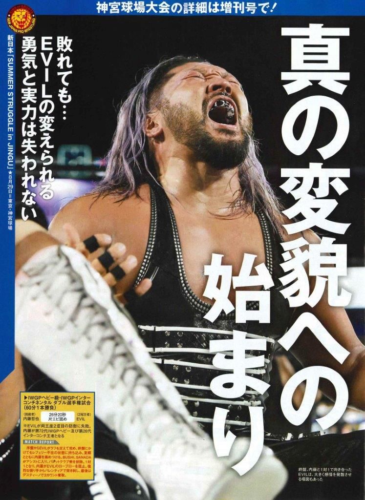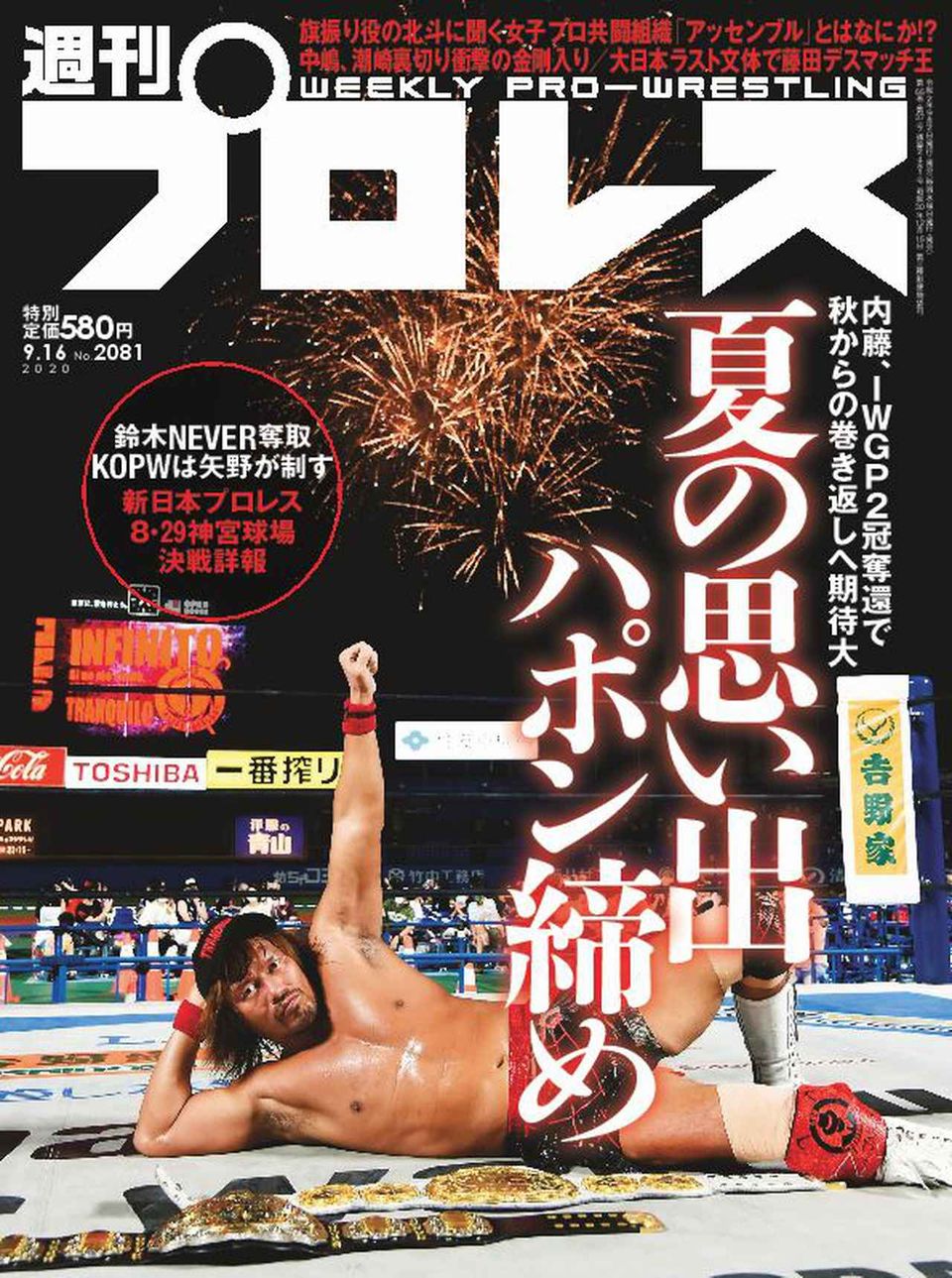今週号の表紙は日本プロレス界今夏最大のビッグマッチ、新日本の神宮球場大会でIWGP二冠王座を奪還。花火をバックにポーズを決める内藤哲也です。同大会は9月3日発売の増刊号で詳報していますが、本誌も巻頭カラーでリポート。新日本関連では巻末言でも木谷高明オーナーにwithコロナ時代の新日本の在り方について聞いています。