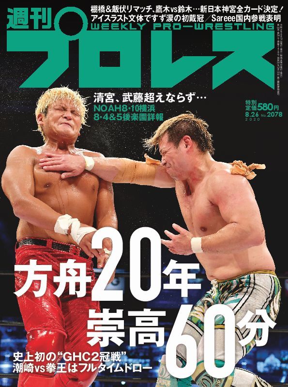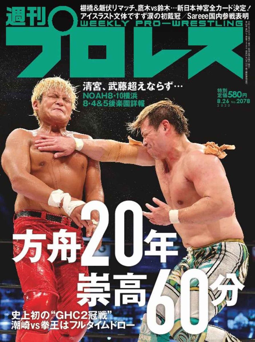 今週号の掲載内容は…史上初の“GHC2冠戦”潮崎豪vs拳王はフルタイムドロー。清宮海斗、武藤超えならず…NOAH8・10横浜、8・4&5後楽園詳報/棚橋弘至&飯伏幸太リマッチ、鷹木信悟vs鈴木みのる…新日本神宮全カード決定!/アイスリボン・ラスト横浜文体で鈴季すず涙の初戴冠/Sareee国内参戦表明、ほか。