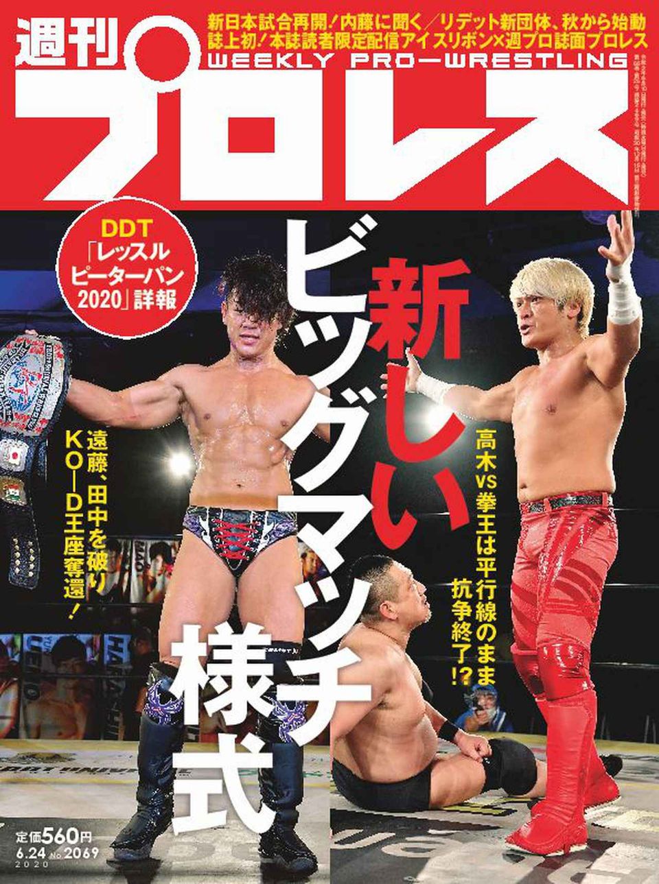 今週号の表紙はDDT配信ビッグマッチ「レッスルピーターパン」から、新KO-D王者となった遠藤哲哉と高木三四郎とのイデオロギー闘争をリングで実現させた拳王です。2デイズでおこなわれたDDTビッグマッチの模様はほかにも注目カード盛りだくさん。巻頭カラーで詳報します。