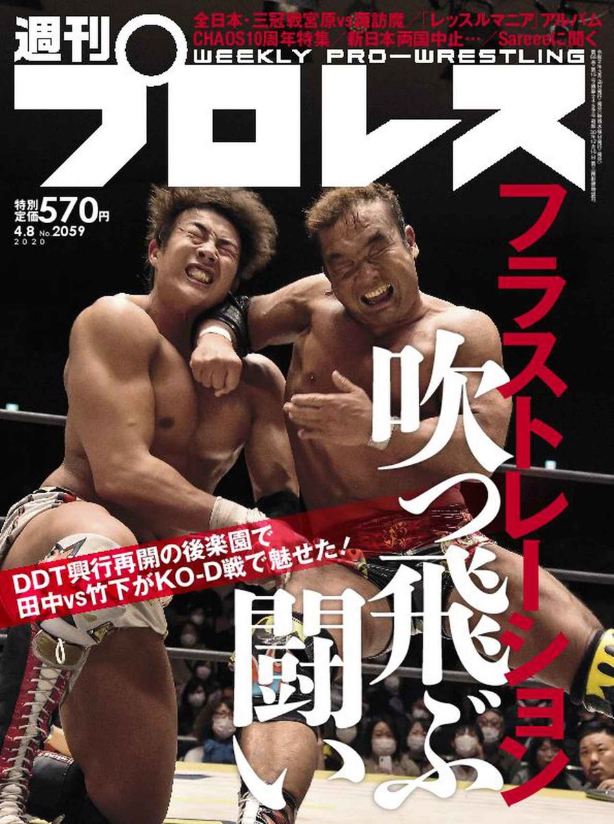 今週号の表紙は興行再開したDDTの後楽園大会のメイン・田中将斗vs竹下幸之介です。それまで政府のイベント自粛要請を受けて無観客試合などをおこなってきたDDTが、3・20より通常大会を再開。試合リポートだけでなく巻頭言では高木三四郎社長に話を世界中を包み込んでいるコロナショックについてDDTとしての見解を聞いています。