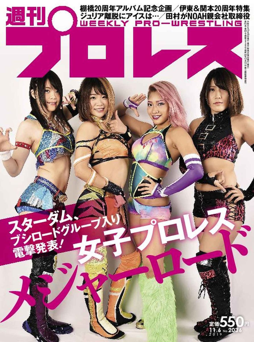 今週号の表紙はブシロードグループ入りが電撃発表されたスターダムから岩谷麻優、星輝ありさ、木村花、林下詩美の4人です。スターダム新体制については巻頭カラーから詳報。会見再録、ロッシー小川社長インタビューほか、新体制発表後最初の試合となった大阪大会もリポート。巻頭言ではあらためて木谷オーナーに話を聞いています。