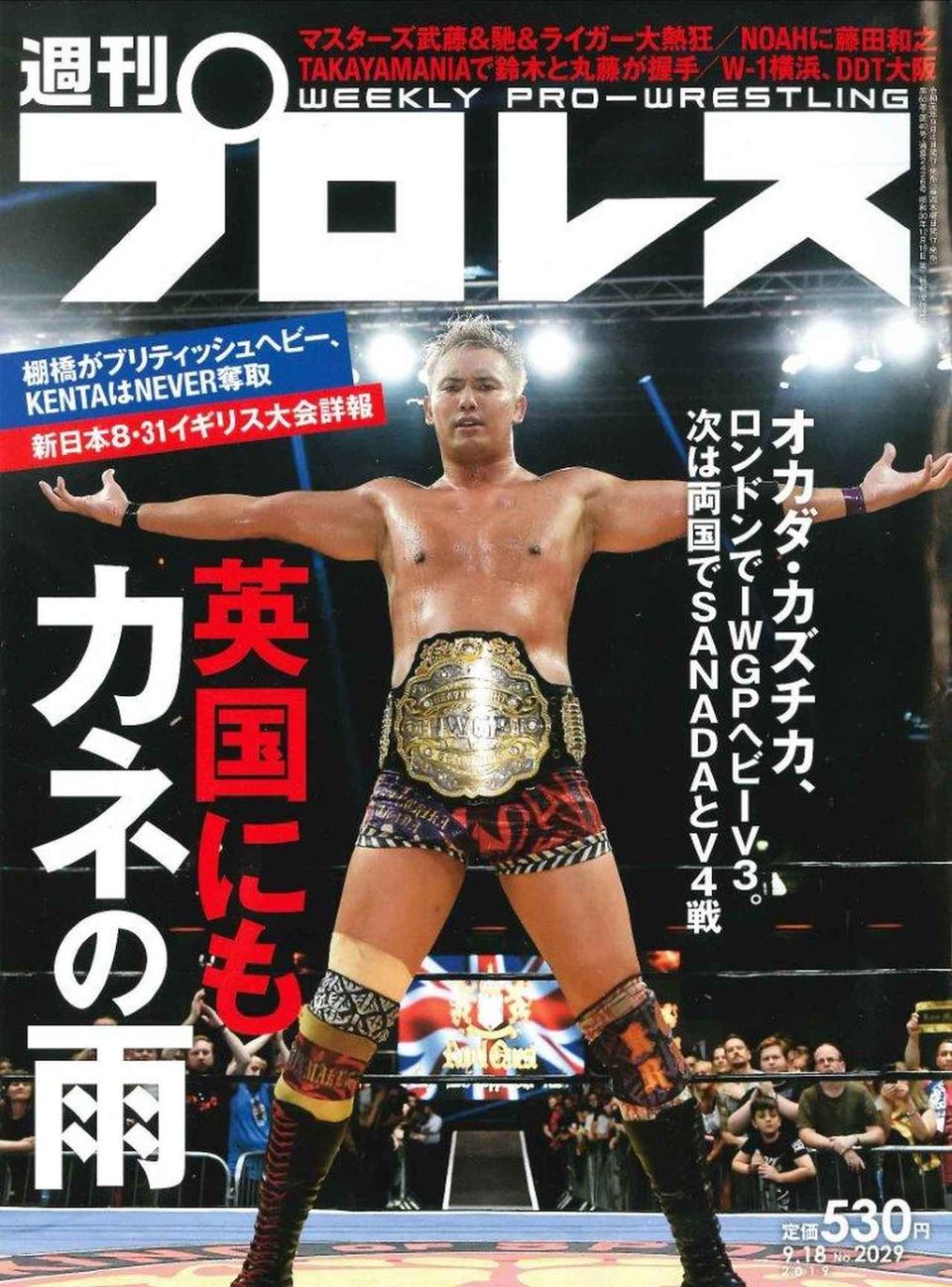 今週号の表紙は新日本初のイギリスビッグマッチとなった8・31ロンドン大会でIWGPヘビーV3に成功したオカダ・カズチカです。同大会はほかにも棚橋弘至がブリティッシュヘビー、KENTAがNEVER無差別王座を奪取するなど、秋からのトップ戦線を左右する動きが続出。新日本関連はほかにもエル・ファンタズモ優勝の8・25アメリカの「SUPER J-CUP」リポート、ヤングライオン杯へ向けて海野翔太と成田蓮に意気込みを聞くなどシリーズオフも盛りだくさんの内容。