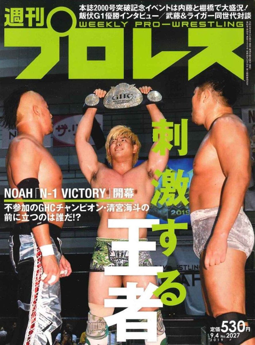今週号の表紙はいよいよ開幕した新生NOAH初のヘビー級シングルリーグ戦「N-1 VICTORY」に不参加を表明して物議をかもしたGHC王者・清宮海斗が表紙となりました。開幕戦8・18名古屋でおこなわれた2つのリーグ戦のほか、巻頭言では清宮と武田有弘社長に話を聞いています。