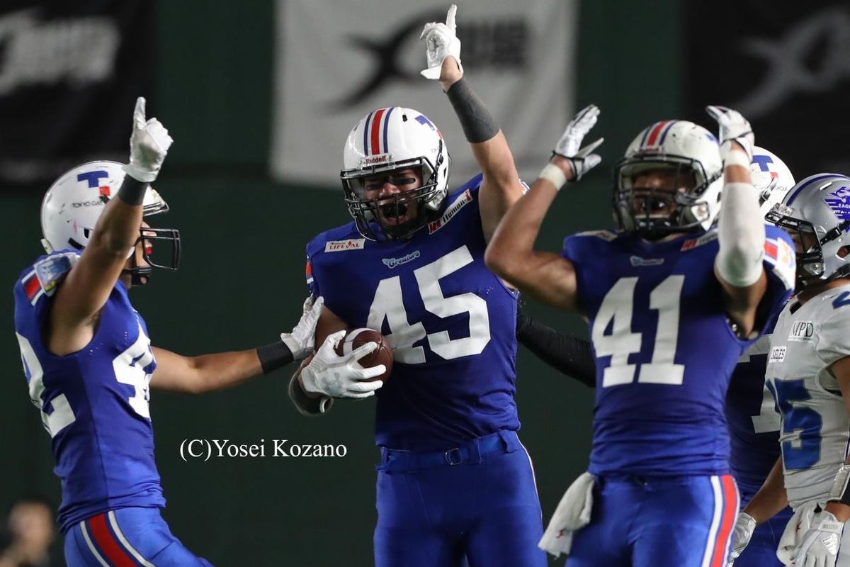 【東京ガス vs 警視庁】第3クオーター、東京ガスのLB吉岡がパスをインターセプトして指を突き上げる
