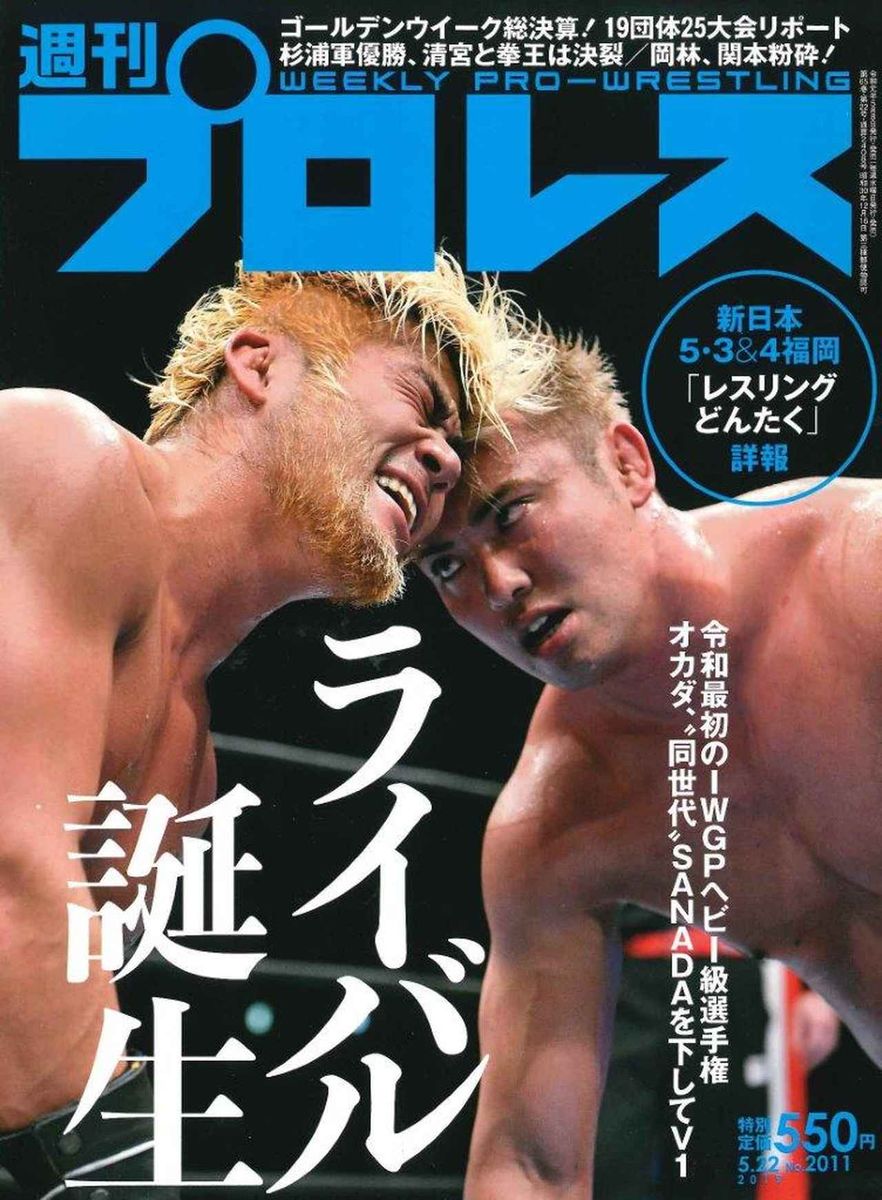 今週号の表紙は新日本「レスリングどんたく」福岡2デイズを締めた、令和最初のIWGPヘビー級選手権試合・オカダvsSANADAです。今年もゴールデイウイーク最大のビッグマッチとなったどんたく決戦は巻頭カラーで詳報。巻頭言ではオカダに6連敗となったものの、支持率を下げないSANADAをクローズアップ。