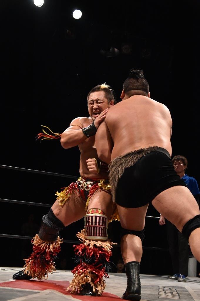 15分経過。近藤が串刺し攻撃も、かわした児玉がエプロンからジャンピングハイを入れてからミサイルキック。これをかわした近藤が走るも、割って入った熊嵐がラリアットで倒す。児玉がフライング・フォアアームもカウント2。