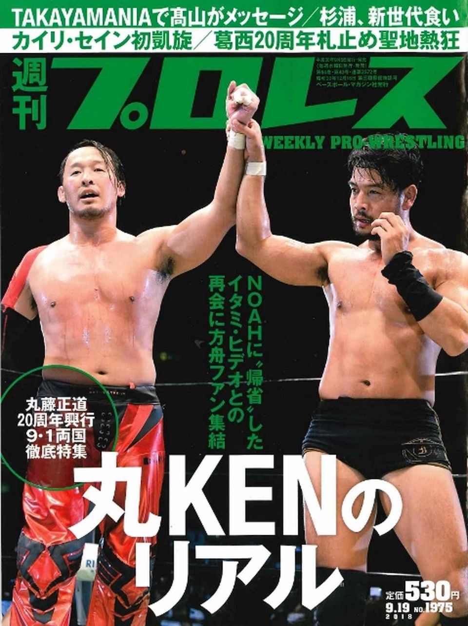 今週号の表紙は丸藤正道デビュー20周年記念大会9・1両国国技館大会のメインで久々の再会を果たした丸藤正道と元KENTAのイタミ・ヒデオです。NOAH同窓会的メンバーが一堂に会した今大会。丸藤vsヒデオはもちろん、そのほかの試合も巻頭カラーから詳報します。この翌日のNOAH後楽園大会もGHCヘビー・杉浦vs北宮を中心にリポートしています。