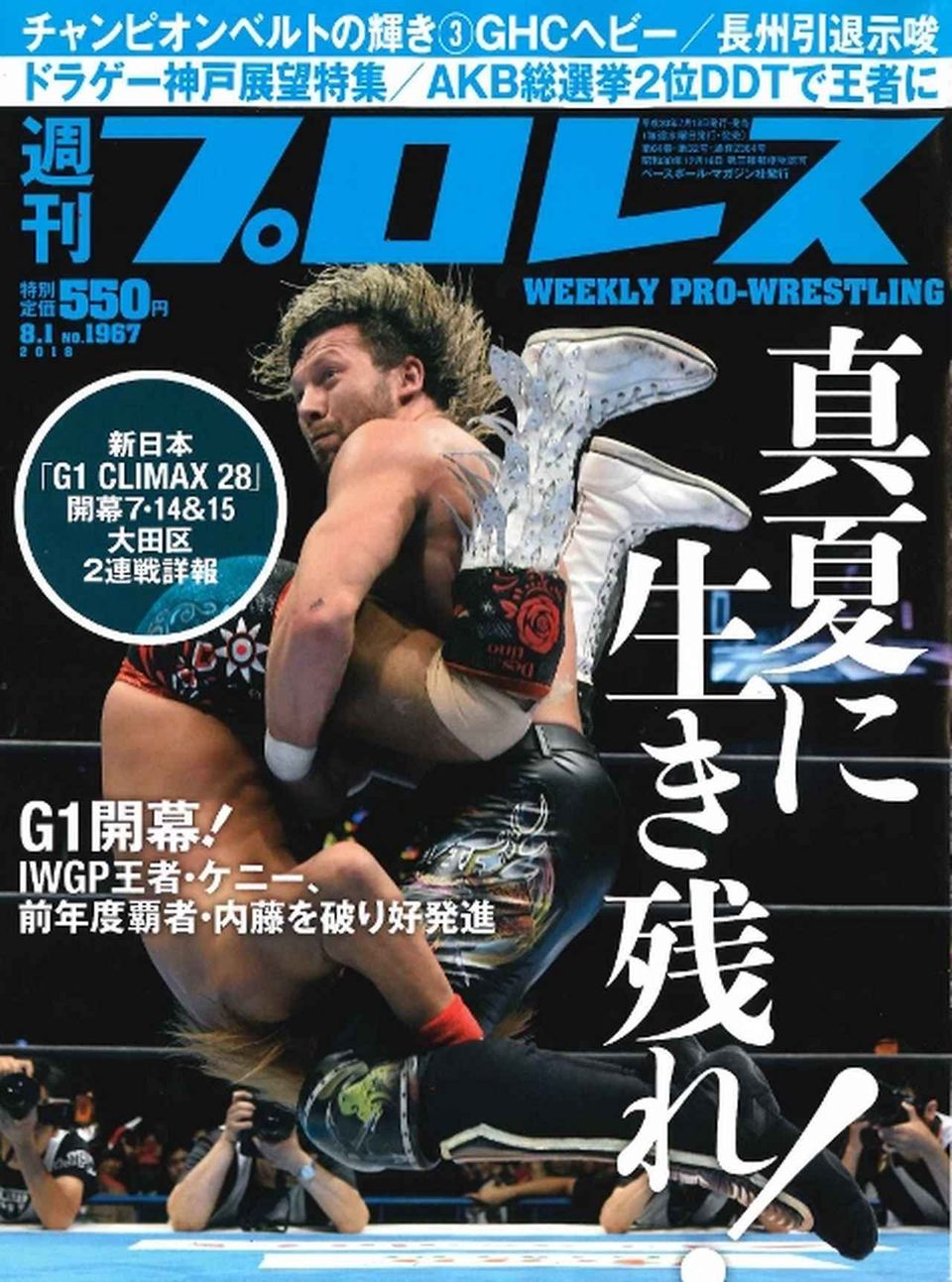 今週号の表紙はいよいよ開幕した新日本「G1 CLIMAX」開幕大田区2連戦で前年度覇者・内藤哲也を破り白星発進に成功したケニー・オメガです。真夏の風物詩としてすっかり定着しているG1は開幕から好カード続出。巻頭カラーのケニーvs内藤のほかオカダvsジェイ、棚橋vs鈴木、飯伏vsザックなど全リーグ戦リポート。今年もG1は全戦追跡するのでお楽しみに。