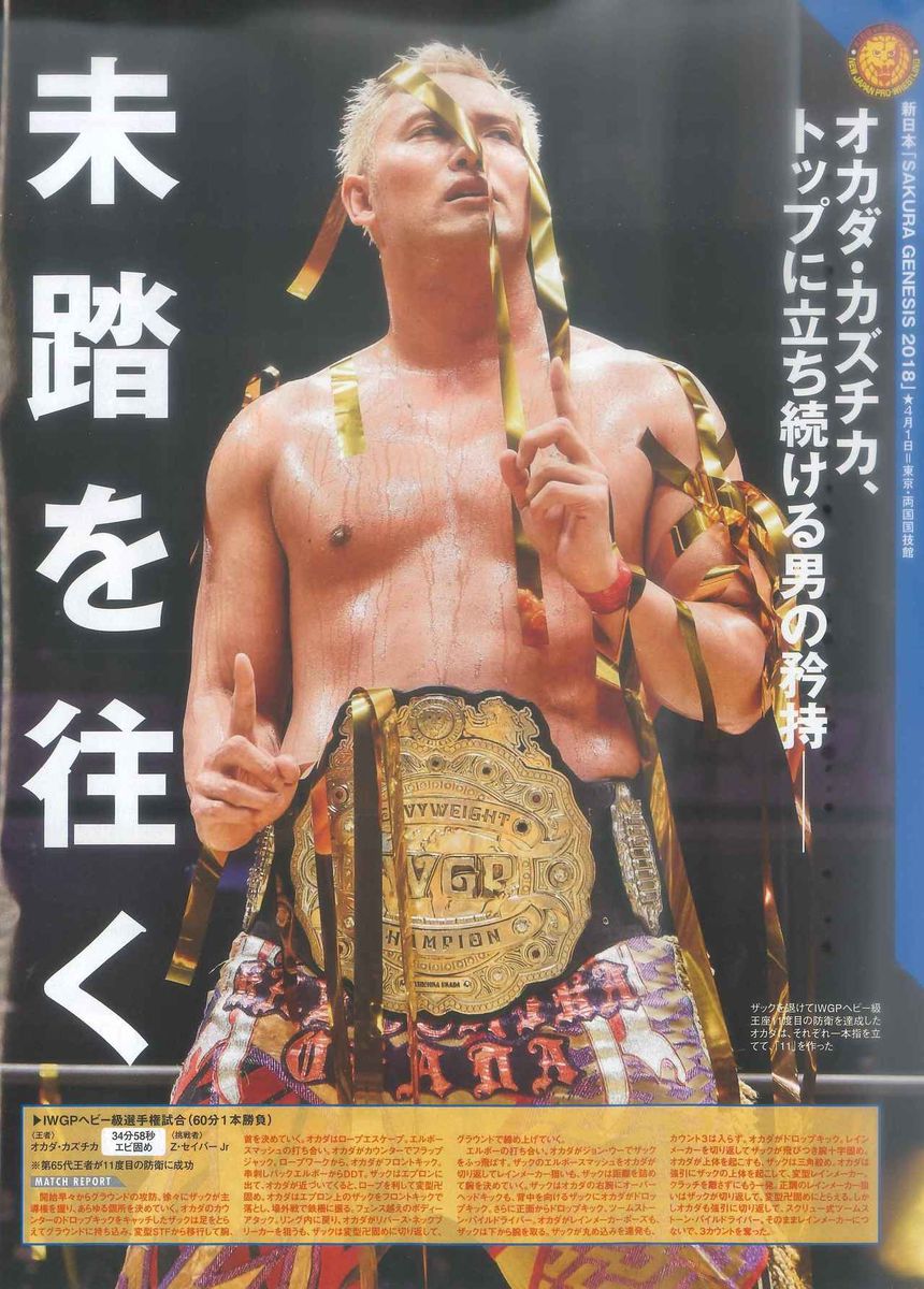 今週号の表紙は新日本両国大会のメイン後、リングで相対したIWGPヘビー級王者のオカダ・カズチカと次期挑戦者・棚橋弘至です。この日、オカダはザック・セイバーJrを下し棚橋のもつ防衛記録V11と首位タイに。5・4福岡ではV11同士の対決が決定。オカダの新記録達成か? 棚橋が阻止して王座返り咲きか!? ゴールデンウイークの大一番へ期待が高まります。