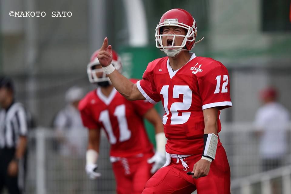 龍谷大ー甲南大、4thダウンギャンブルからの先制TDを見届け、雄叫びをあげる甲南QB井原ー 場所: EXPO FLASH FIELD