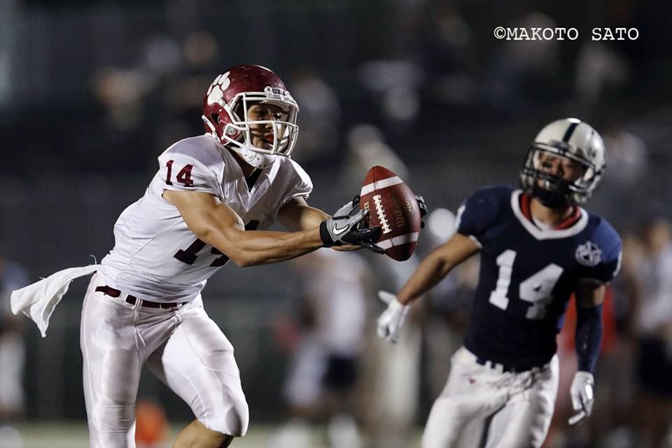 立命館大ー桃山学院大、第4Q、ポストパターンでQB西山からの49ヤードパスをレシーヴする立命主将WR近江ー 場所: EXPO FLASH FIELD