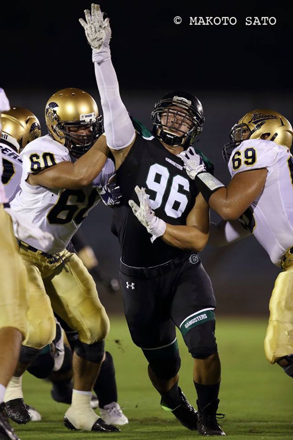 ダブルチームを外し関大QBにプレッシャーをかける京大主将DL植村ー 場所: 京都市西京極総合運動公園陸上競技場兼球技場