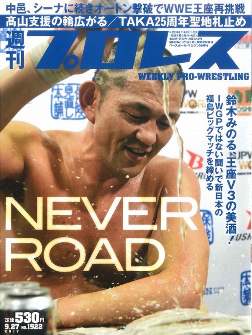 今週号の表紙は新日本9・10福島ビッグマッチでNEVER王座V3に成功した鈴木みのるがバックステージでベルトにビールをかけてほくそ笑む姿となりました。9月の新日本3週連続ビッグマッチの第一弾となった同大会は巻頭カラーから特集。NEVER6人タッグ王座戦はオカダ・カズチカとのIWGPヘビー前哨戦でもあったEVILが試合後ベルトにキスする衝撃ショットも含めて詳報。