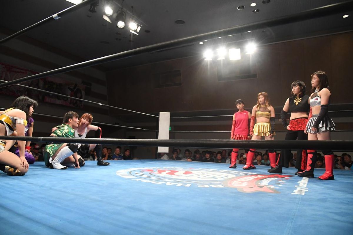 コブラツイストをかけているのがTeamDATE。写真左から華DATE、法DATE、直DATE。やられているのがテキーラ沙弥、長崎まる子、トトロさつき