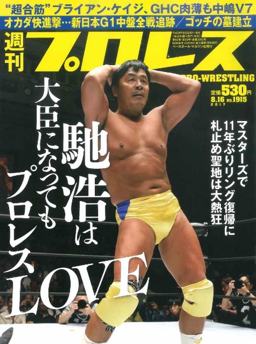 週プロ早版 8・16号(№1915)表紙はマスターズで11年ぶりリング復帰した馳浩、NOAH“超合筋”ブライアン・ケイジがGHCに肉薄も中嶋V7 オカダ快進撃…新日本G1中盤全戦追跡、ゴッチの墓建立 8月2日(水)発売 定価530円