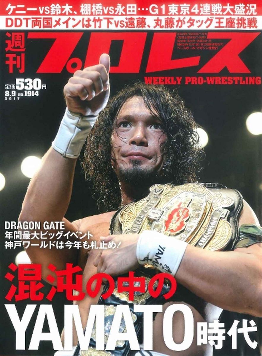 今週号の表紙はドラゴンゲート7月恒例のビッグマッチ7・23神戸ワールド大会を締めたドリームゲート王者・YAMATOとなりました。新世代のT-Hawkの挑戦を退けたYAMATOが堂々V6達成のメインをはじめ、土井成樹&吉野正人の“土井吉”が久々タッグ王座挑戦など注目試合満載。今年も札止め大盛況となったドラゲーの年間最大イベントを巻頭カラーから伝えます。
