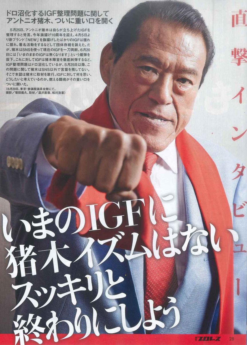 5月25日、アントニオ猪木は自らが立ち上げたIGFを整理すると発言。今年旗揚げ10周年を迎え、4月5日より新ブランド「NEW」を旗揚げしたばかりのIGFは揺れに揺れ、署名活動をするなどして団体存続を訴えた。だが、猪木はSNSを使って現在のIGFを一刀両断。6月20日には「いまのままIGFは無くなります」という爆弾を投下。これに対してIGFは猪木陣営を徹底糾弾するなど、IGF整理問題はドロ沼化しているが、5月25日以降、この問題に関して猪木はSNS以外で言葉を残してない。そこで本誌は猪木に取材を敢行。IGFに対して何を思い、どうしたいと考えているのか。燃える闘魂がその重い口をついに開いた。