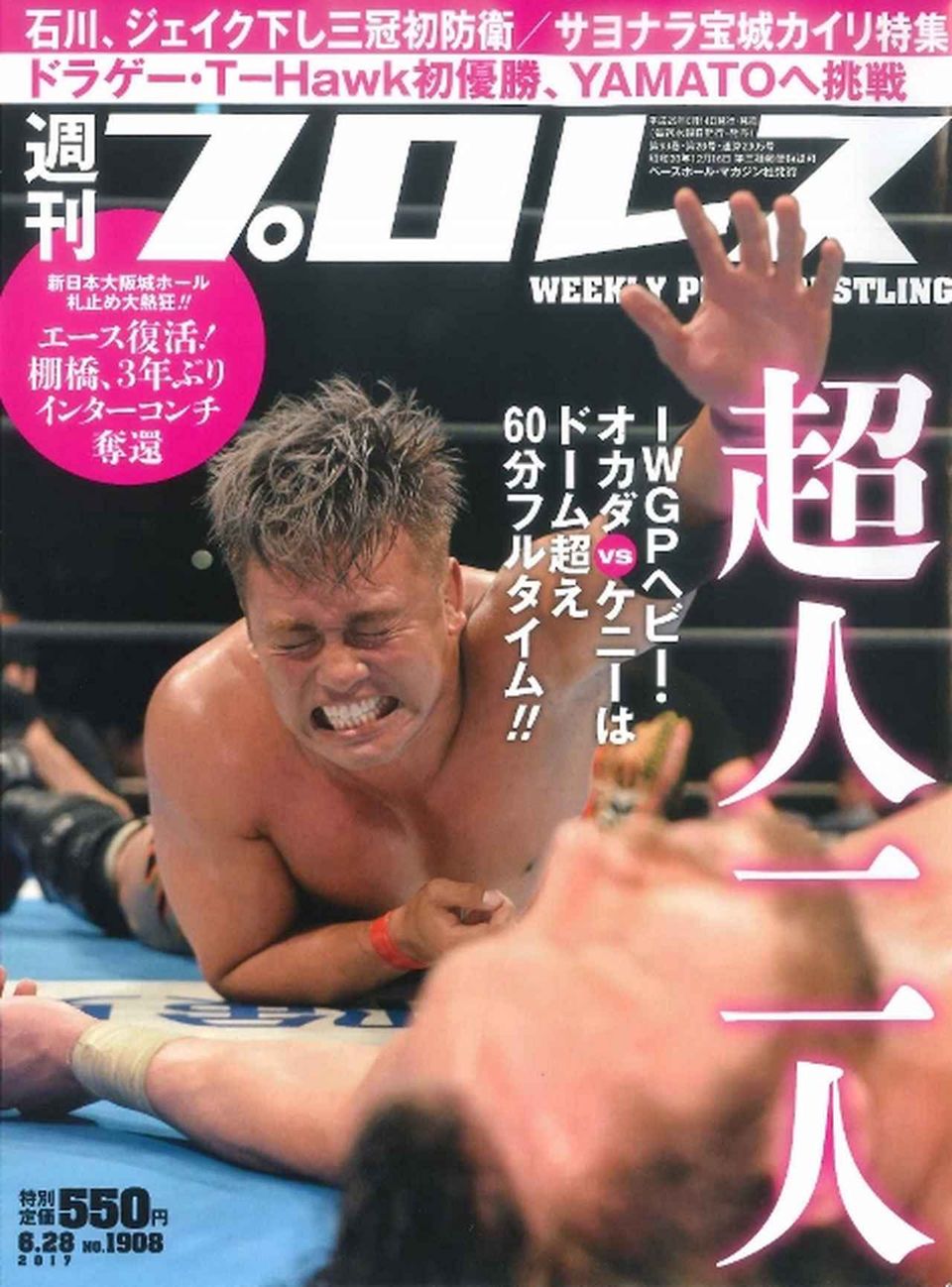 今週号の表紙は新日本6・11大阪城ホール大会からケニー・オメガとのIWGP戦で60分フルタイムの死闘を闘い抜いたオカダ・カズチカです。同大会は巻頭カラー23ページで大特集。オカダvsケニーは9ページ、内藤vs棚橋のIWGPインターコンチは6ページと通常以上のボリュームで札止め大熱狂となった当日の興奮を誌面で再現。