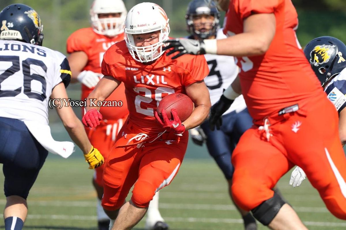 【LIXIL-オール三菱】アサヒ飲料から移籍のRB白神は8キャリー58ヤードで、RB陣を牽引した=2017年5月20日、撮影:小座野 容斉 (Yosei Kozano)