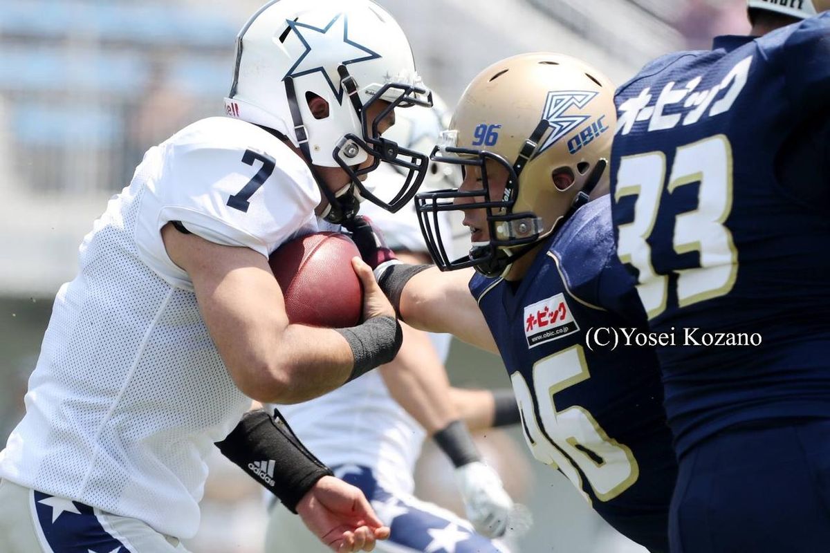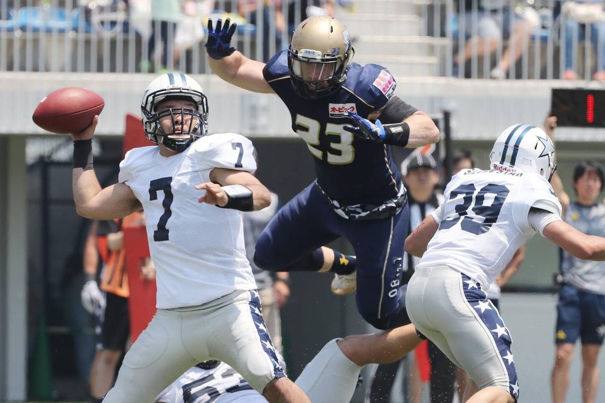 【オービック-アサヒビール】オービックDLバイロン・ビーティー・ジュニアが、OLをなぎ倒して、アサヒビールQB安藤に襲い掛かる=2017年5月21日、撮影:小座野 容斉 (Yosei Kozano)