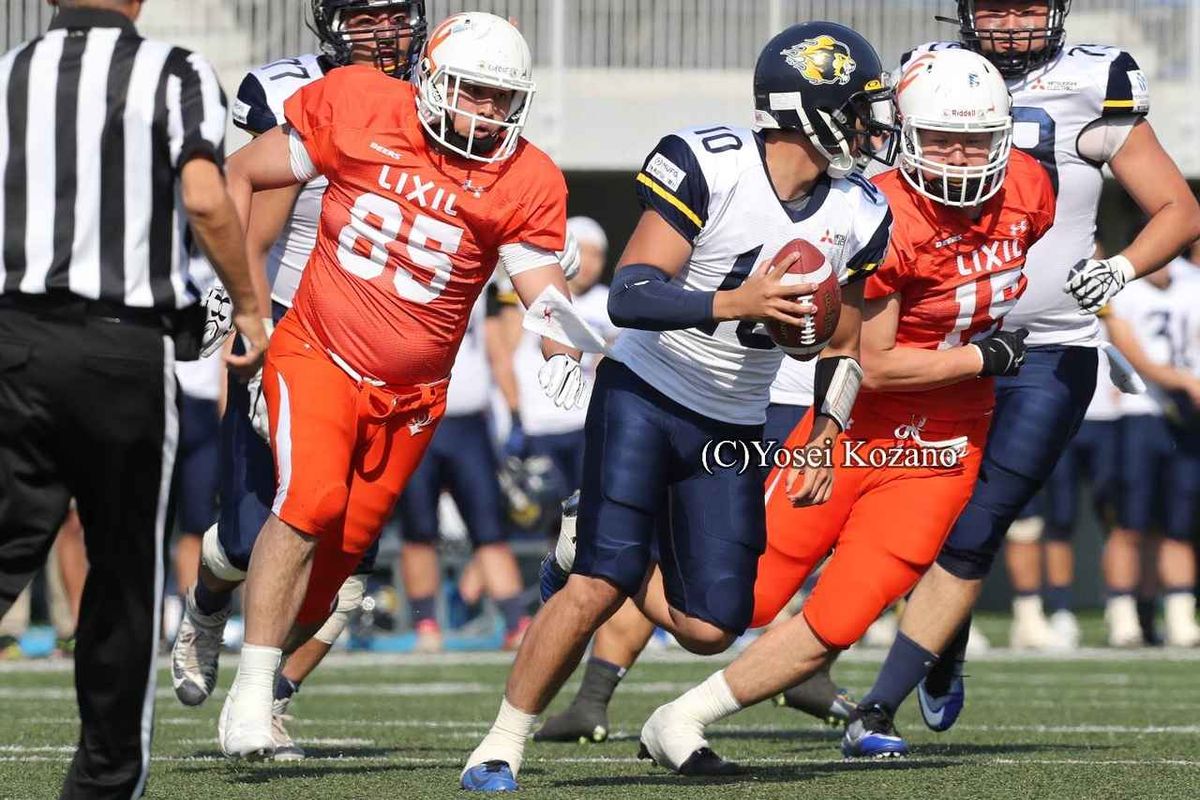 【LIXIL-オール三菱】オール三菱QB斉藤にプレッシャーをかけるLIXILの新戦力DL甲斐(85)と朝倉(15)。甲斐は中央大の主将として、朝倉は関学大のスターターとして活躍した=2017年5月20日、撮影:小座野 容斉 (Yosei Kozano)