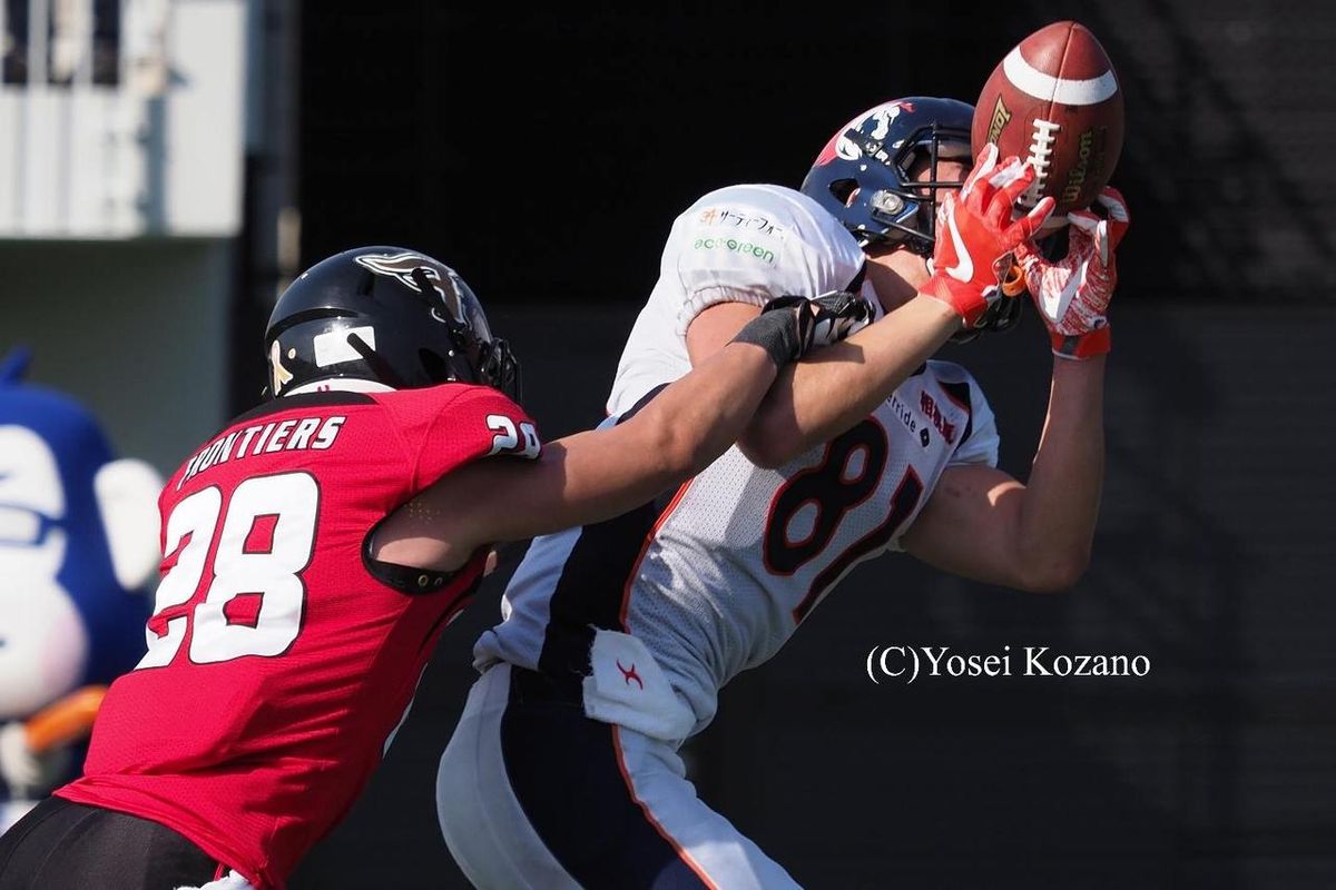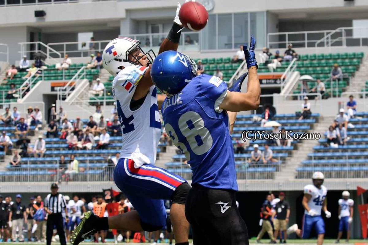 【ノジマ相模原-富士通】第4クオーター、ノジマ相模原のWR鈴木がマンカバーの富士通DB石井を振り切って、QBガードナーからのロングパスをキャッチしTD。今春LIXILから移籍の鈴木は、190センチの長身で40ヤードを4秒台半ばで走る才能を開花できるか=2017年5月21日、撮影:小座野 容斉 (Yosei Kozano)