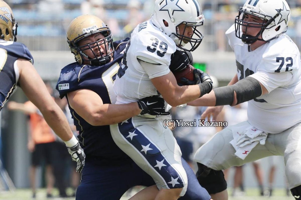 【IBM-東京ガス】新戦力のLB坂口が低く速いタックルでロスを奪う.坂口は立教大で副将を務め、Xリーグでは富士通に所属。今季IBMに移籍してきた=2017年5月20日、撮影:小座野 容斉 (Yosei Kozano)
