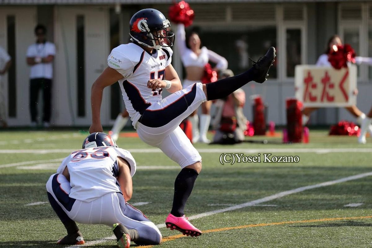 【ノジマ相模原-富士通】ノジマ相模原期待のルーキーK/P、市森。全国高校サッカー本大会で2ゴールを挙げたストライカーで、大学からアメフットへ。中央大ラクーンズでも長距離キッカーとして活躍してきた=2017年5月21日、撮影:小座野 容斉 (Yosei Kozano)