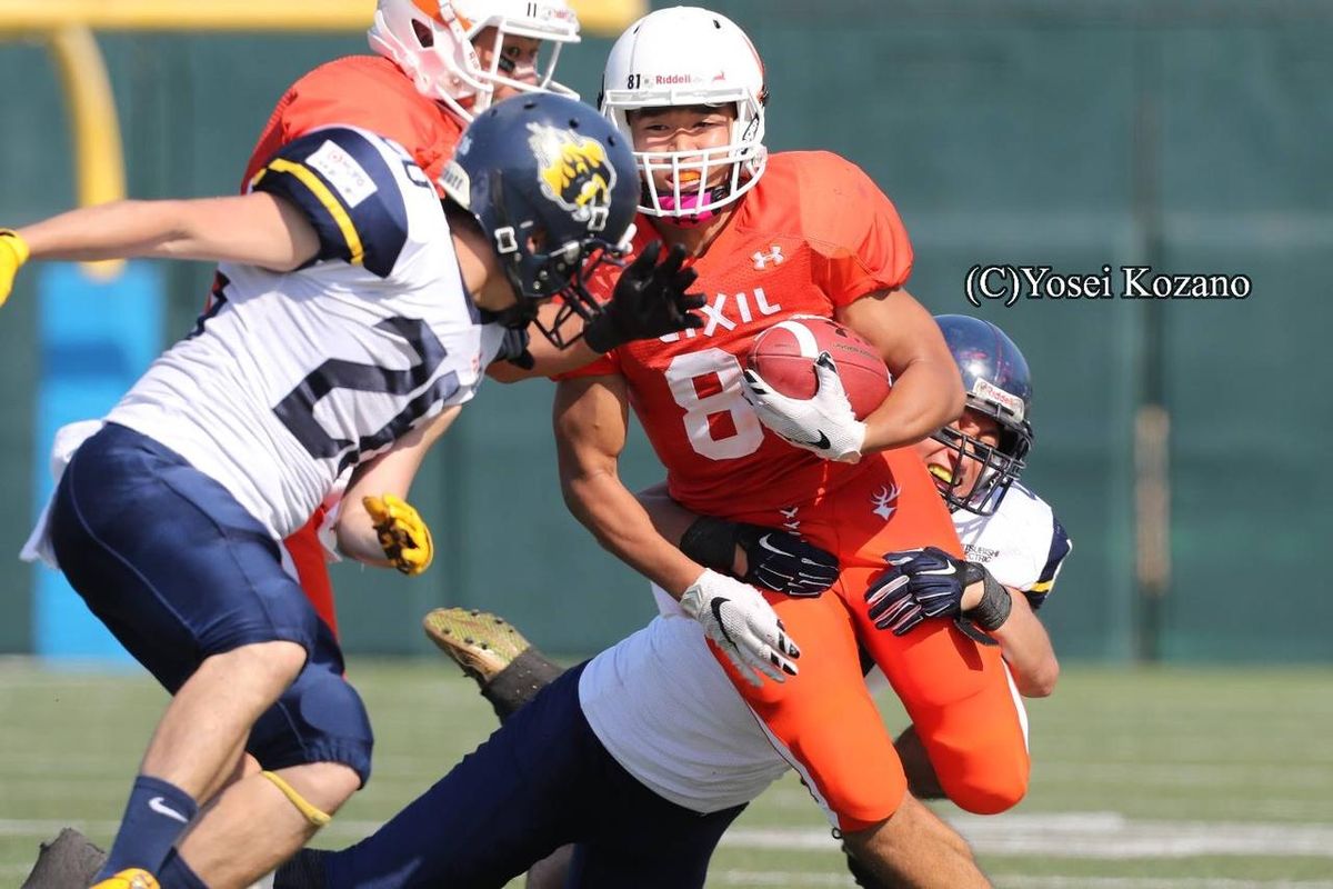 【LIXIL-オール三菱】タックルされながら前進するWR石毛。2年目の今季は更なる飛躍を遂げたい=2017年5月20日、撮影:小座野 容斉 (Yosei Kozano)