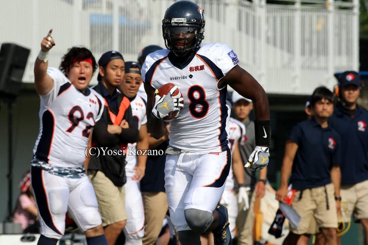 【ノジマ相模原-富士通】後半開始早々、富士通のLB2人のタックルをかわし、60ヤードの独走TDを決めたノジマ相模原のQBガードナー=2017年5月21日、撮影:小座野 容斉 (Yosei Kozano)