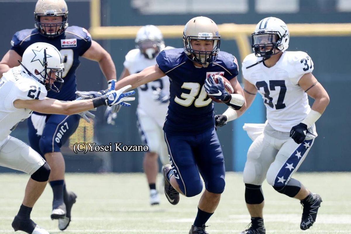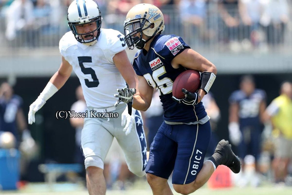 【オービック-アサヒビール】第2クオーター9分、オービックWR前田がパスを受けて走り63ヤードのTD。この日2TDの前田、脚力自慢が揃うオービックレシーバー陣の中でもその快足は要注目だ=2017年5月21日、撮影:小座野 容斉 (Yosei Kozano)