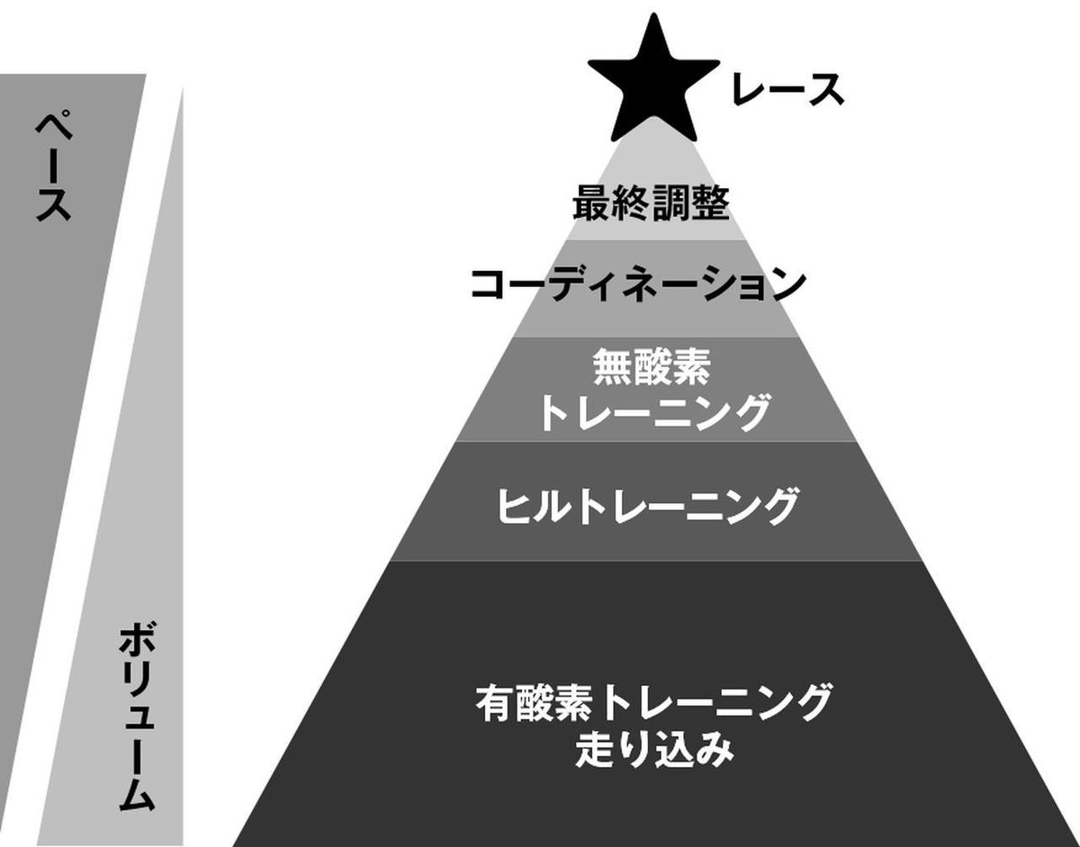 まずは、長くゆっくり走ることで土台を築き上げる。そしてそれから、レースの準備をするためのトレーニング(つまり、速く走るトレーニング)をより多くする。リディアードはこうして、「トレーニングのピラミッド」を確立させたのです(図参照)。いわゆる「ピリオダイゼーション(期分け)」です。