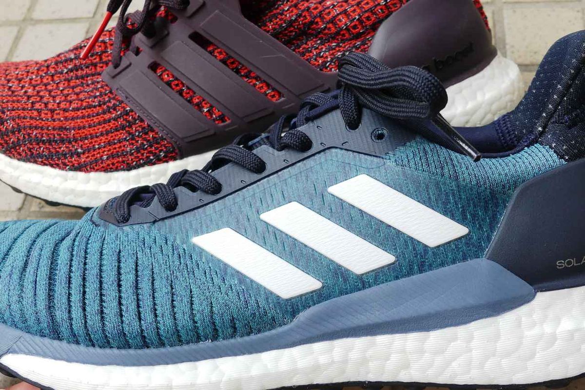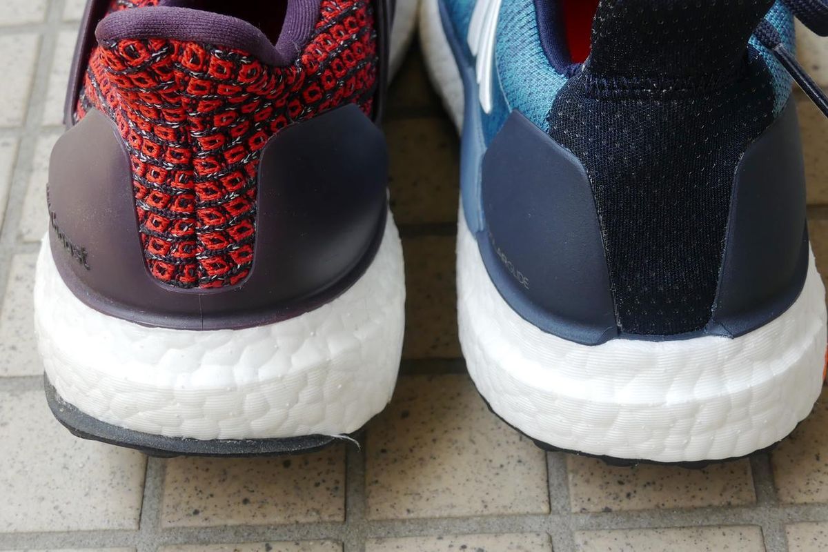 ソーラーグライドとウルトラブースト。踵部のブーストフォームの厚さはほぼ同じ。