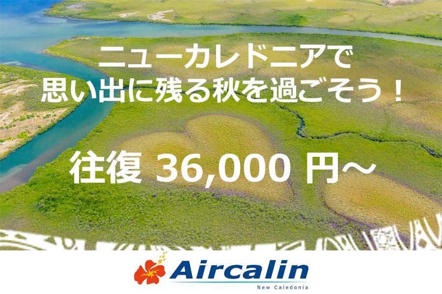 7月20日〜9月15日の間、エアカランが秋の特別価格キャンペーンを開催します。日本(成田・関空)〜ニューカレドニアの往復チケットが、36,000円〜というお得な価格でゲットできます(9〜12月渡航分/燃油サーチャージ・諸税別途)。