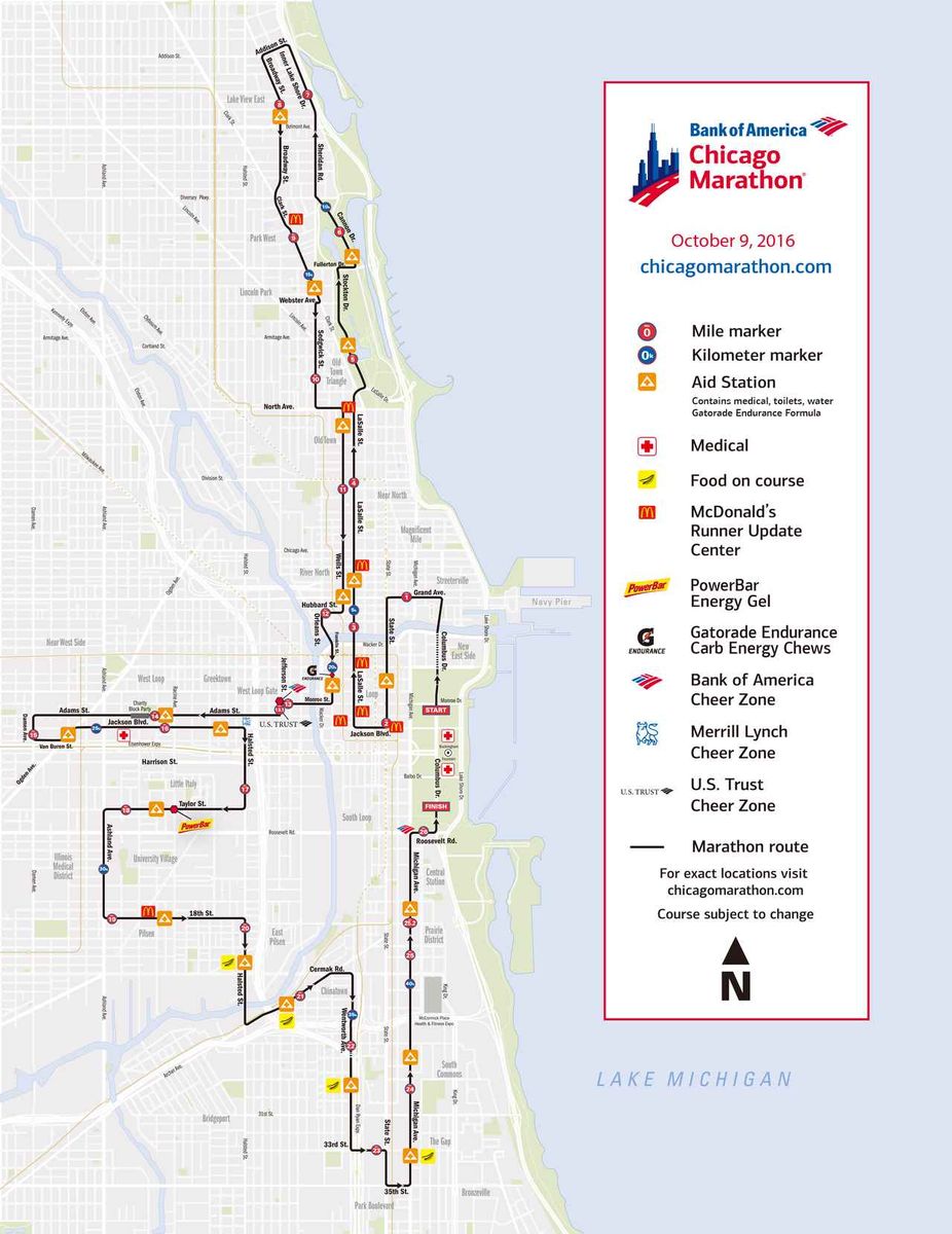 マラソンコースはミシガン湖に面した緑の多いグランドパークをスタートし、高層ビル群を抜け、ダウンタウン、ユナイテッドセンター、住宅街やチャイナタウンなど、様々なエリアを抜け、最後は同じグランドパークへ戻ってくる。