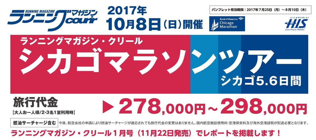 ランニングマガジン・クリール編集部では、ワールドマラソンメジャーズのひとつ、4万人を超える大規模マラソンであり、平坦であることから高速コースでも知られるシカゴマラソンを走れる「クリール シカゴマラソンツアー」を実施する。