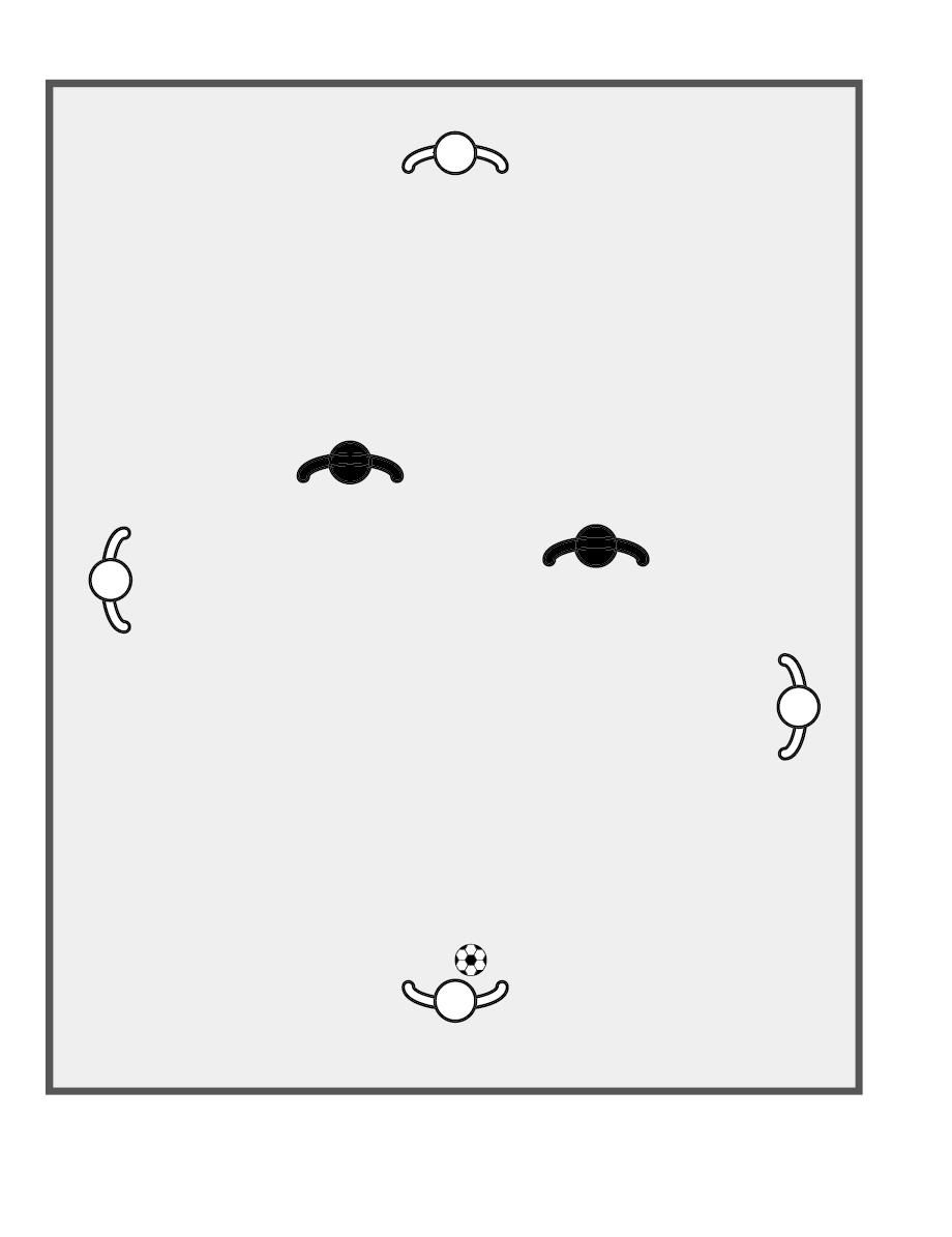 進め方:(1)長方形のグリッドで、縦方向のパスを意識する「4対2」を行なう。攻撃側の狙いは、攻撃方向に縦パスを通すこと(縦パスを受ける選手はFWやボランチを想定)。守備側は、縦パスのコースを切りながらボール奪取を狙う。(2)攻撃側が明らかに優勢なら、グリッドを狭くする。逆に守備側が明らかに優勢なら、グリッドを広くする