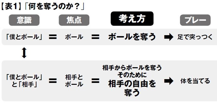 「ボールだけでなく相手を見る」、「ボールを奪うというより、まずは相手にボールをコントロールさせないことを考える」というように、相手の自由を奪うようになると言い換えてもいいでしょう。