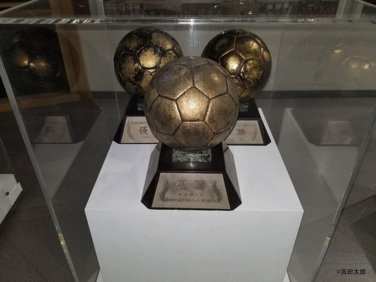 『全国サッカー選手権大会』の優勝チームに贈られる金色の『民放杯』。このトロフィーは返還しないもので、清水桜が丘高校には清水商業高校時代に獲得(85年度、88年度、93年度)した3個が飾られている ©吉田太郎