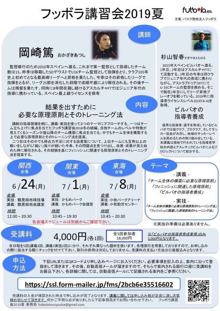 『サッカークリニック』の連載企画「スペイン流の考えるトレーニング」はスペインのバスク州の名門クラブ、アスレチック・ビルバオで育成年代の指導に長く携わっているランデル・エルナンデス・シマル/コーチによる好評企画です。そしてランデル・コーチの翻訳を務めているのが、同じくバスク州にあるアスカルチャFTで監督を務める岡崎篤氏です。その岡崎氏が今年も、6月と7月に関西、関東、東海で指導者講習会を実施することになりました。『スペイン公認最上級ライセンス(UEFAプロ)』を保持する岡崎氏による講習会のテーマは「結果を出すために必要な原理原則とそのトレーニング法」です(今回は2015年からビルバオで指導している杉山智春氏による講義も含まれています)。ぜひ、ご参加ください!