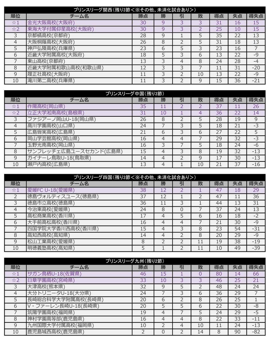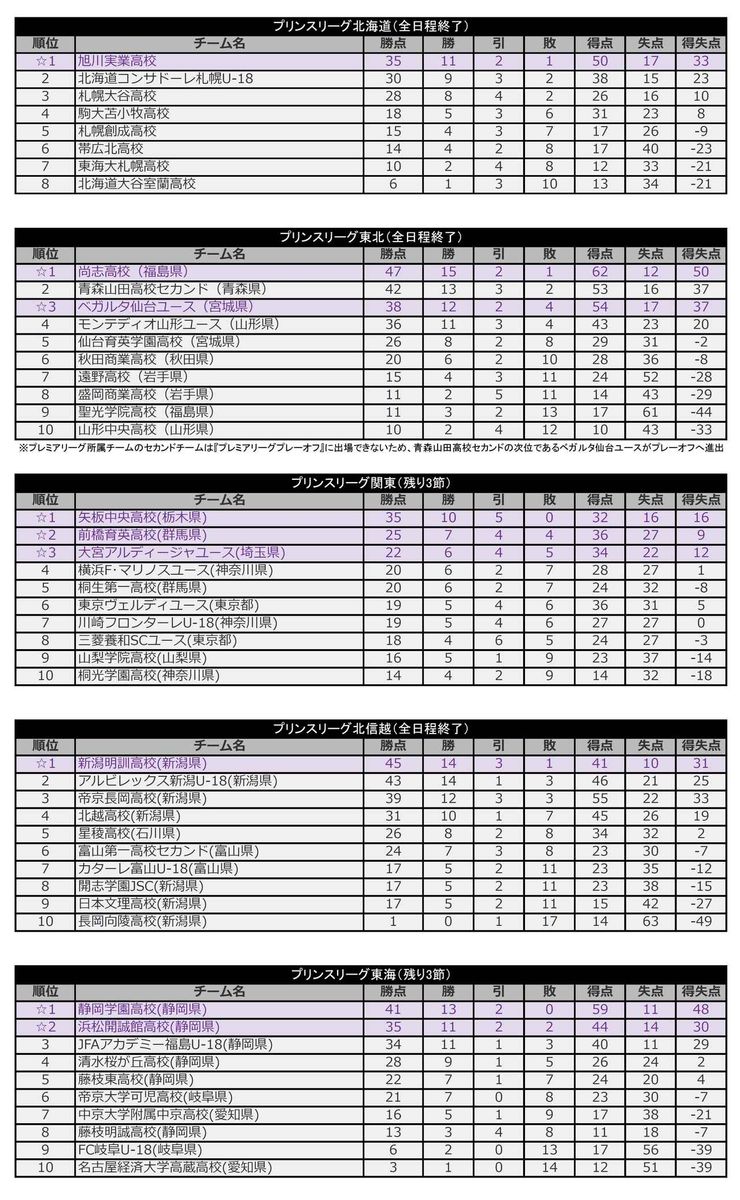 ※11月22日12時時点では、全日程を終了しているプリンスリーグ北海道、プリンスリーグ東北、プリンスリーグ北信越のみ、プレーオフ進出チームが決定(☆印のある旭川実業高校、尚志高校、ベガルタ仙台ユース、新潟明訓高校)。それ以外の6地域の☆印はプレーオフ進出枠を指す