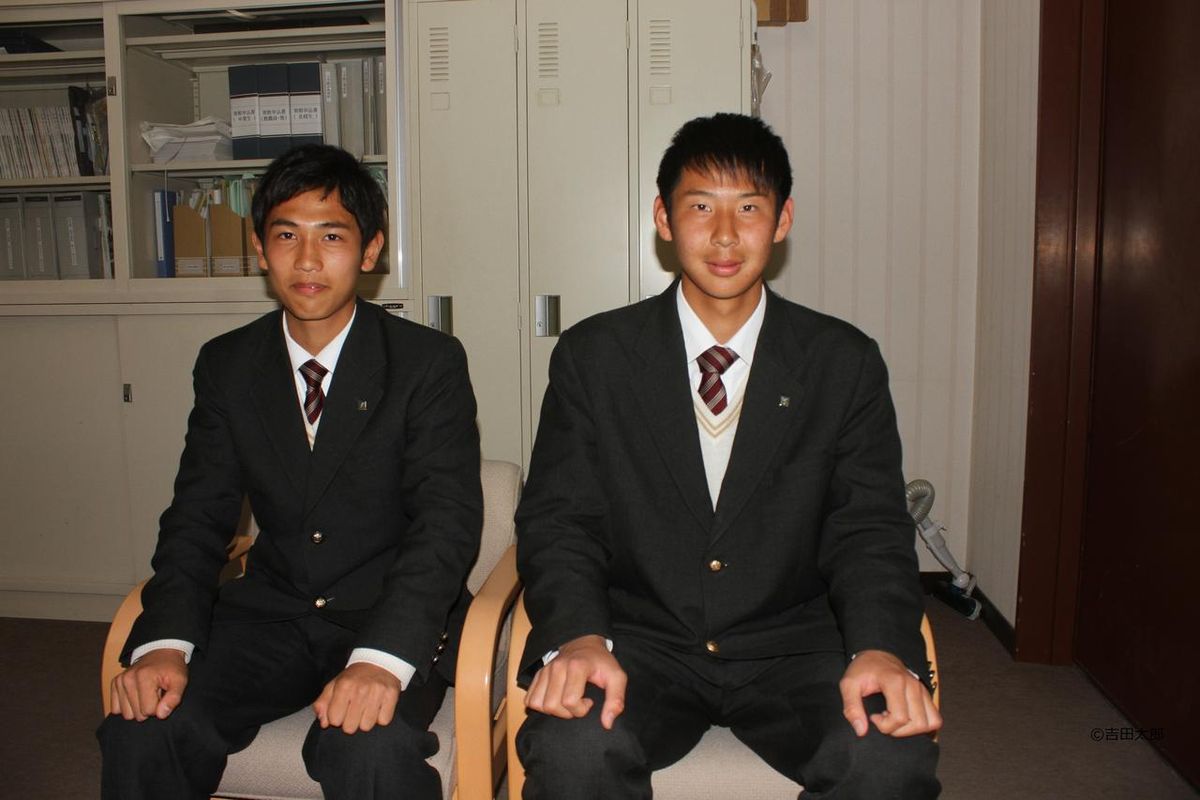 中学生時代から「昌平高校のコーチング・スタッフ」の指導を受けてきた、現在高校3年生の渋屋航平(右)と丸山聖陽(左)。FC LAVIDAから昌平高校に入って来る選手が年々増えているという 写真/吉田太郎