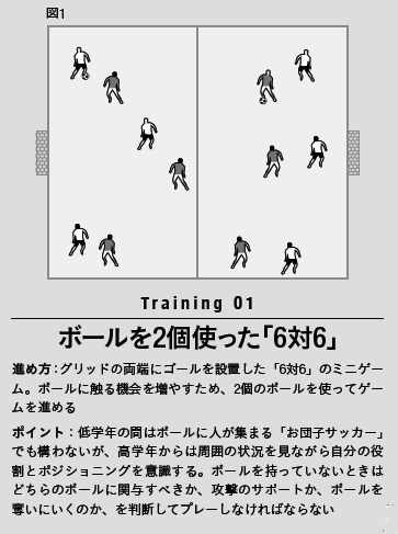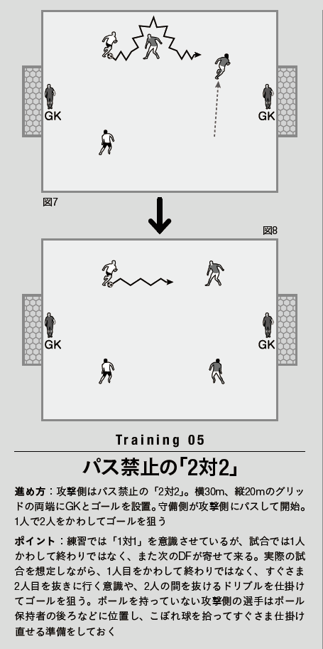 川上 状況の設定を与えることです。例えば、中盤や最終ラインの局面という設定で行なう場合の「1対1」は、相手に簡単にボールを奪われてはいけない状況です。