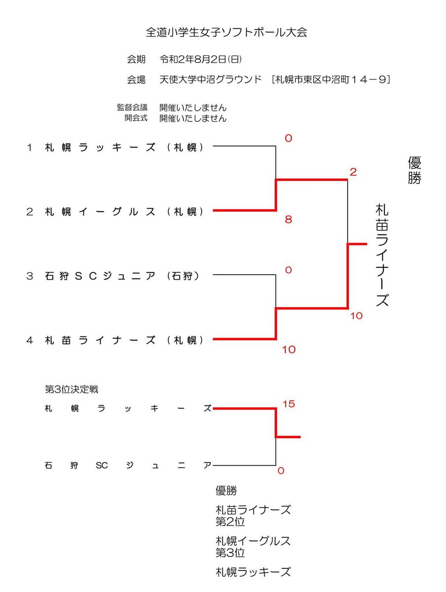 8月2日(日)、北海道札幌市・天使大学中沼グラウンドにて『全道小学生女子ソフトボール大会』が開催され、札苗ライナーズが札幌イーグルスを10対2で破り優勝した。そのほかの結果は、下記のとおり。