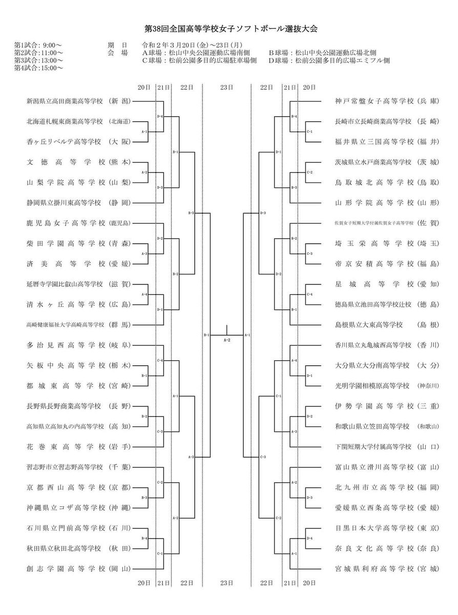 高校ソフトボールの春の祭典『第38回全国高校選抜大会』が、女子は3月20日(金)から23日(月)まで愛媛県松山市にて開催される。組み合わせは下表のとおり。春の頂点に輝くのはどのチームか――。