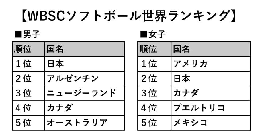 世界野球ソフトボール連盟(以下、WBSC)より、2019年末時点のソフトボール世界ランキングが発表され、男子ソフトボールのカテゴリーで日本が初めて1位にランクインした。