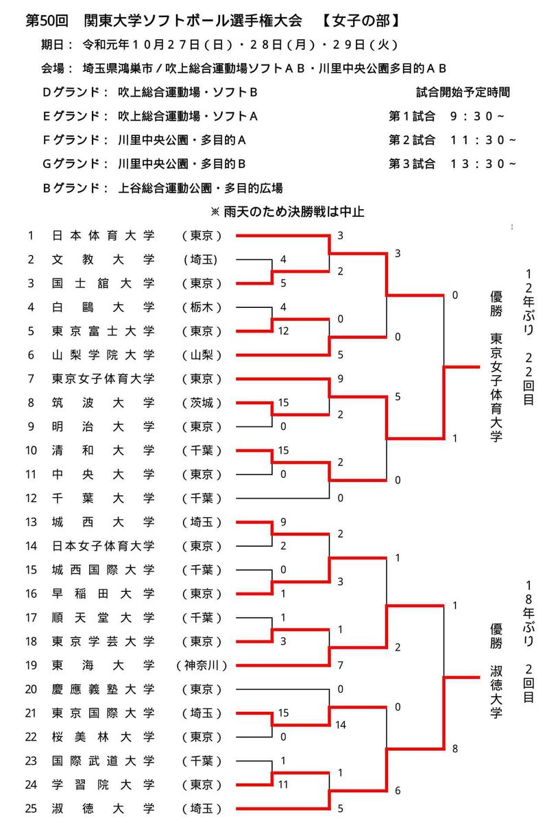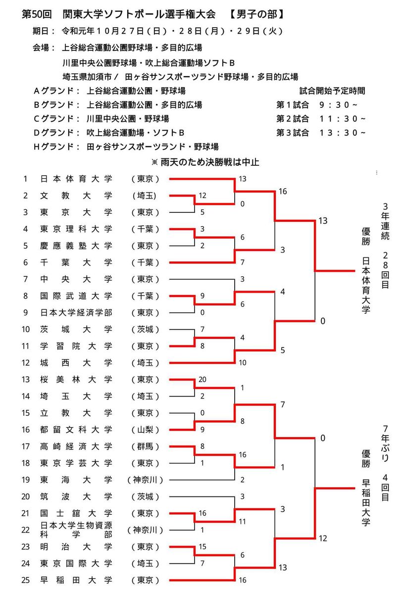 10月27日(日)~29日(火)、埼玉県鴻巣市・吹上総合運動場、川里中央公園にて『第50回関東大学選手権大会』が開催された。台風の影響で決勝戦は中止となり、男子は日本体育大、早稲田大、女子は東京女子体育大、淑徳大が優勝した。そのほかの結果は、下記のとおり。