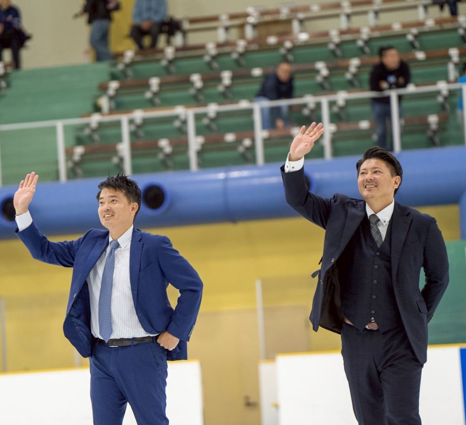 試合後、スタンドにあいさつする外崎慶監督。左は弟の潤アシスタントコーチ(元日本製紙クレインズDF)。かつては札幌で「日本一の中学生チーム」雪印ジュニアを引っ張る選手だった(ⒸSTARS KOBE)