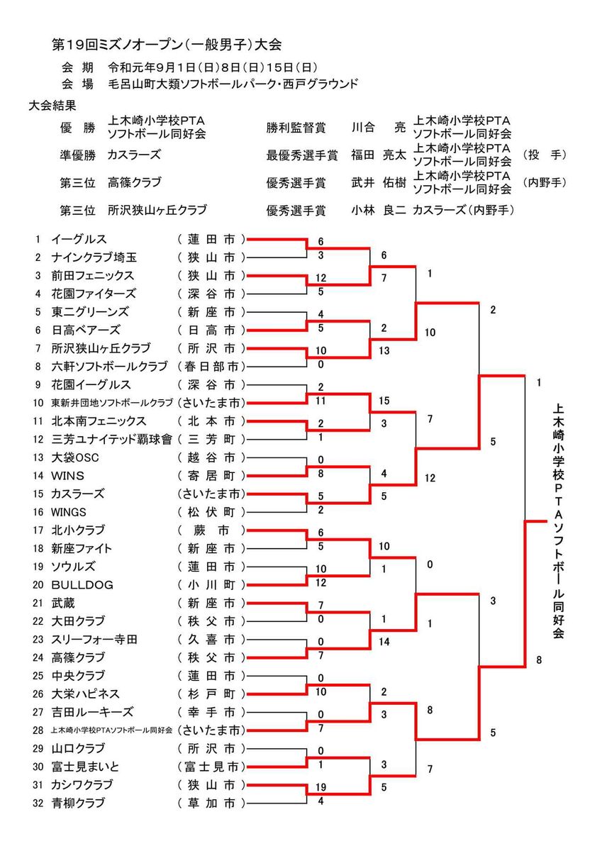 埼玉県入間郡毛呂山町にて『第19回ミズノオープン(一般男子)大会』が開催され、上木崎小PTA同好会がカスラーズを8対1で破り優勝した。そのほかの結果は、下記のとおり。